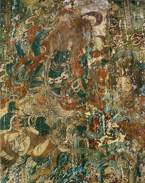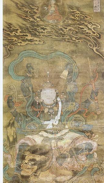 在中國的水陸壁畫大多呈現-座下騎獅(犼)、三面六臂or三面八臂-