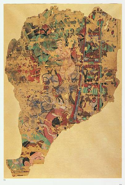 而在同窟中也有一張唐代殘片,學者將之定名為「Fragment of Paradise Scene」(天堂景象殘片),也是一位眼光慈祥的夜叉鬼手高托捧小兒……